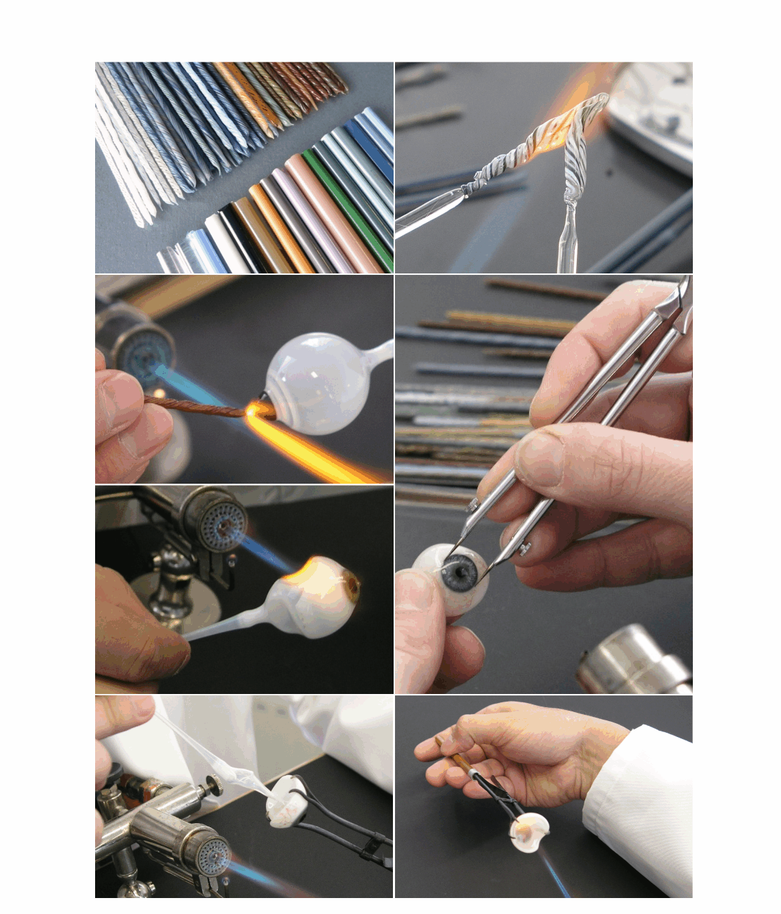 Aus einer Glasröhre und einer Fülle von bunten Strukturglasmalstiften zeichnet der Augenkünstler - gleich einem Maler, die Irisfarbe auf den Glasrohling. Durch eine spezielle Schichttechnologie und klaren Kristall wirkt die so gestaltete Iris täuschend echt in 3D-Effekt!
